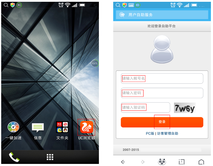 1、打开手机浏览器并在地址栏中输入http://192.168.2.200:8080网址,在用户自助平台中输入账号名、密码及验证码,点击“登陆”按钮。