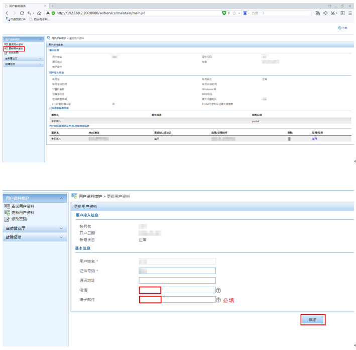 3、点击导航栏中的“用户资料维护”-“更新用户资料”链接,在更新用户资料页面中输入相关信息。(电子邮件必填,用于密码丢失后找回)
