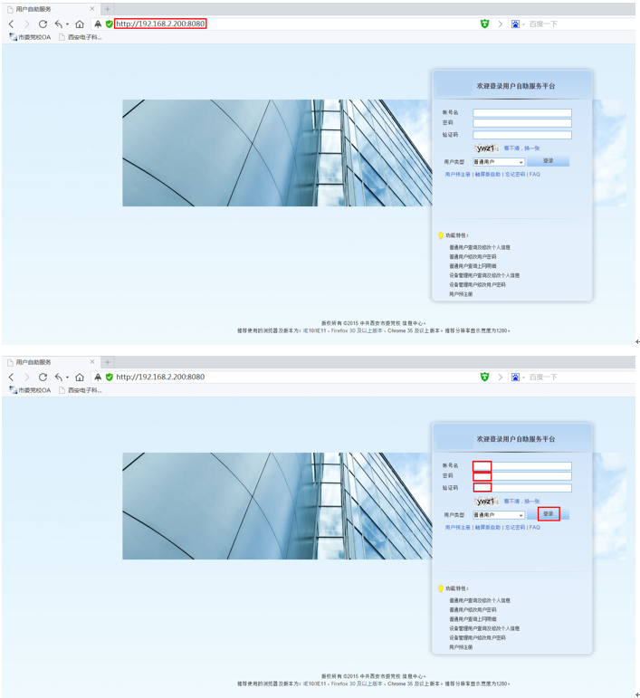 1、打开电脑中的浏览器并在地址栏输入http://192.168.2.200:8080网址,在用户自助平台中输入账号名、密码及验证码,点击“登陆”按钮。