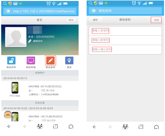 2、点击导航栏中的“修改密码”按钮,并在修改密码页面中输入“原始密码”及“新密码”并点击“完成”按钮。