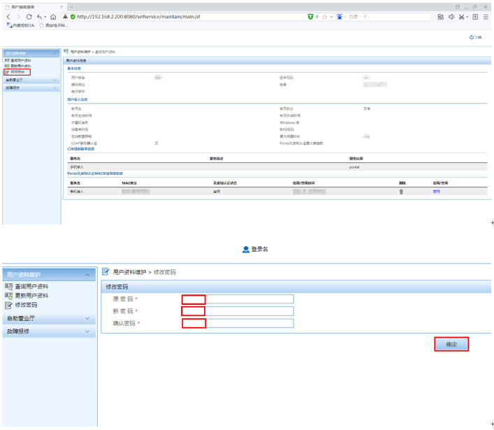 2、点击导航栏中的“用户资料维护”-“修改密码”链接,在修改密码页面中输入“原始密码”及“新密码”并点击“确定”按钮。