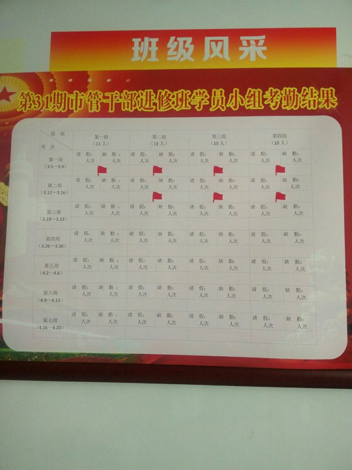 第五,严格小组评比。各主体班根据不同小组出勤情况,每周进行盘点,优秀小组得一面小红旗。这一做法使得各班学员形成“比、学、赶、帮”的良好班级氛围。