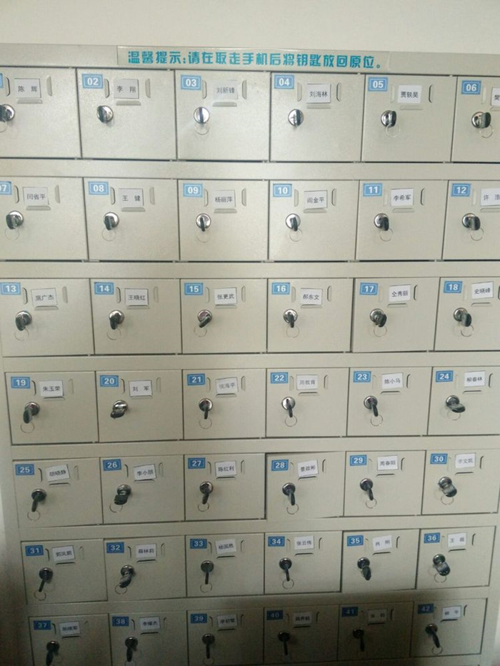 首先,严格手机存放制度。学员入学第二天,各班主任就及时根据各班报到情况打印好学员姓名标签,并贴在教室手机存放柜上。和以往相比,有了学员姓名的手机存放柜,更能激起学员上课存放手机的自觉性。