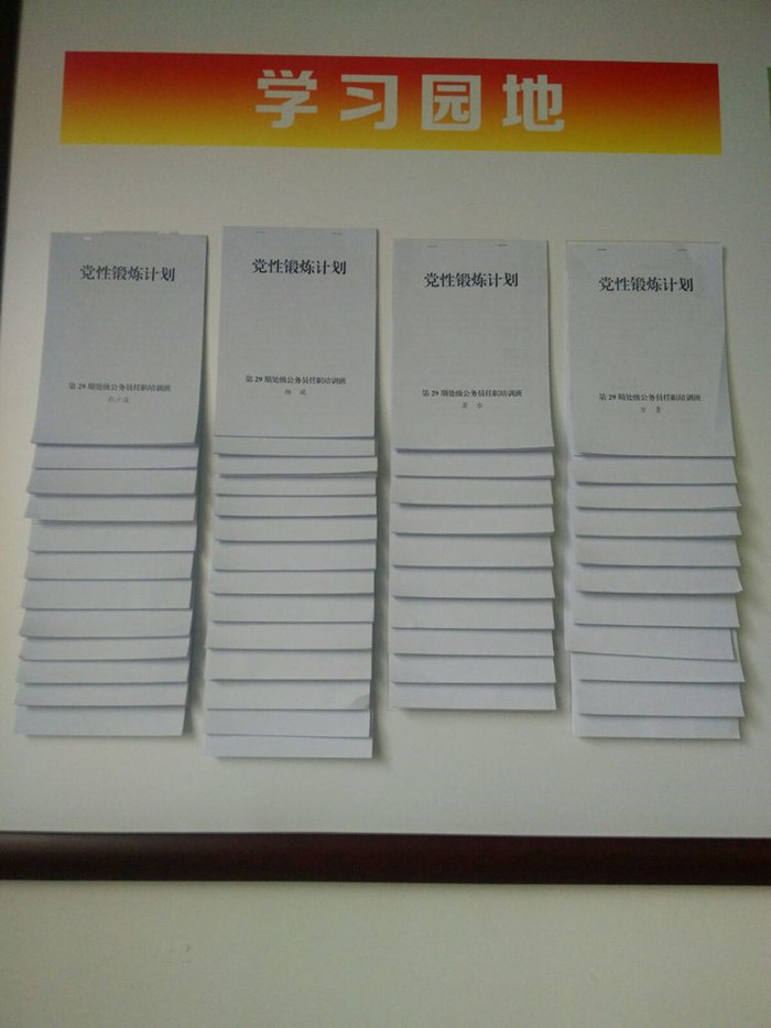 第四,严格落实党性教育六个“一”活动。开学之初便安排学员撰写个人党性锻炼计划,上交后,统一张贴在教室后面学习原地,学员随时可以看到自己的党性锻炼计划,以起到提醒的目的,学员间也能相互监督,达到自律与他律的结合。目前在校主体班学员的党性锻炼计划都已上墙。