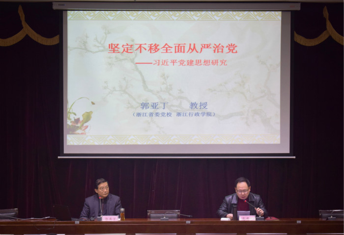 郭亚丁教授围绕“坚定不移全面从严治党——习近平党建思想研究”,系统阐述了习近平党建思想形成的前提和条件,习近平全面从严治党思想的主要内容和习近平党建思想的主要特点。