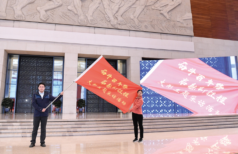 2021年1月18日,中宣部在国家博物馆举行“奋斗百年路 启航新征程”大型主题采访活动启动仪式。中央和地方主要媒体的编辑记者代表在北京主会场和各省区市分会场参加启动仪式。图为记者代表展示“奋斗百年路 启航新征程”大型主题采访活动旗帜。 新华社记者 申宏/摄
