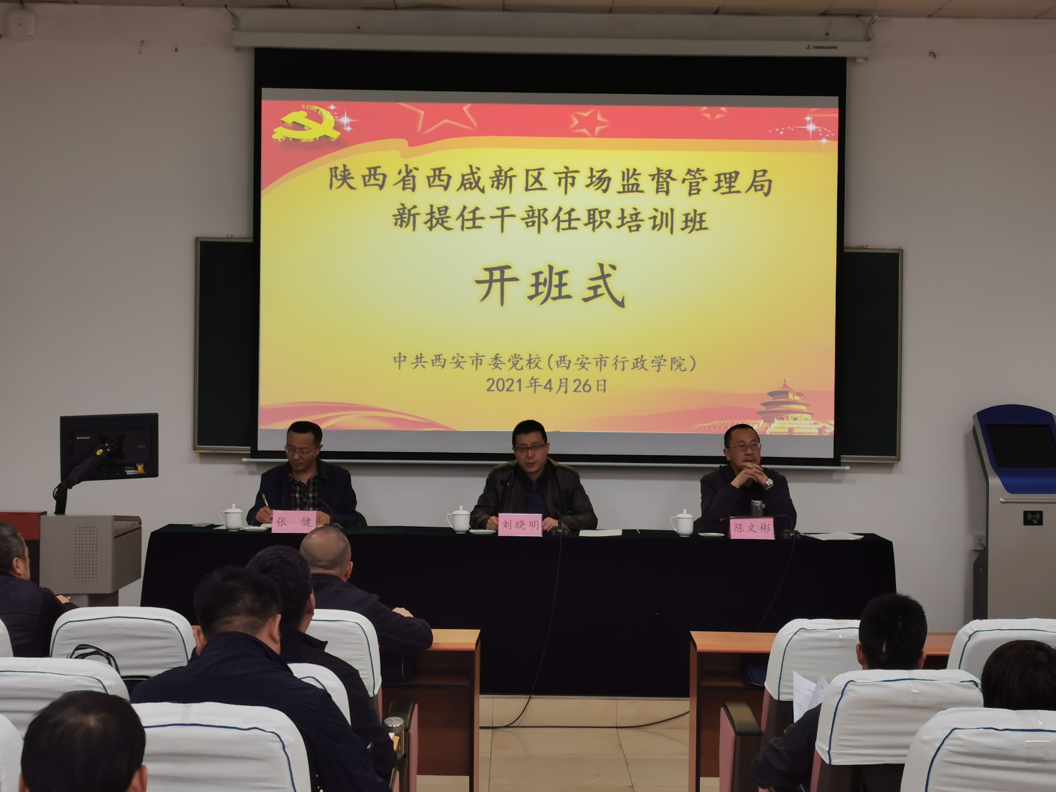 2021年4月19日,我校先后举办了两期陕西省西咸新区市场监督管理局新提任干部任职培训班。西咸新区市场监管局党委委员、纪委书记张琦做开班动员,我校公务员培训处处长颜红对参训学员管理提出相关参训要求,西咸新区市场监管局组织人事处处长许家刚主持了开班式。