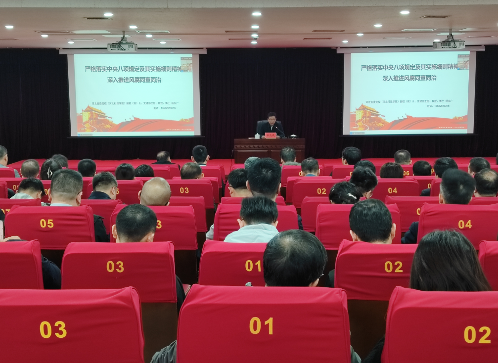 河北省委党校(河北行政学院)副校(院)长、党建部主任、教授、博士杨东广围绕《严格落实中央八项规定及其实施细则精神 深入推进风腐同查同治》为全校教职工作了辅导授课。校领导及各处部室主要负责人学习了习近平总书记关于加强党的作风建设的重要论述、中央八项规定及其实施细则精神。组织全体教职工集体观看了廉政警示教育片《持续发力纵深推进——强化正风肃纪》。