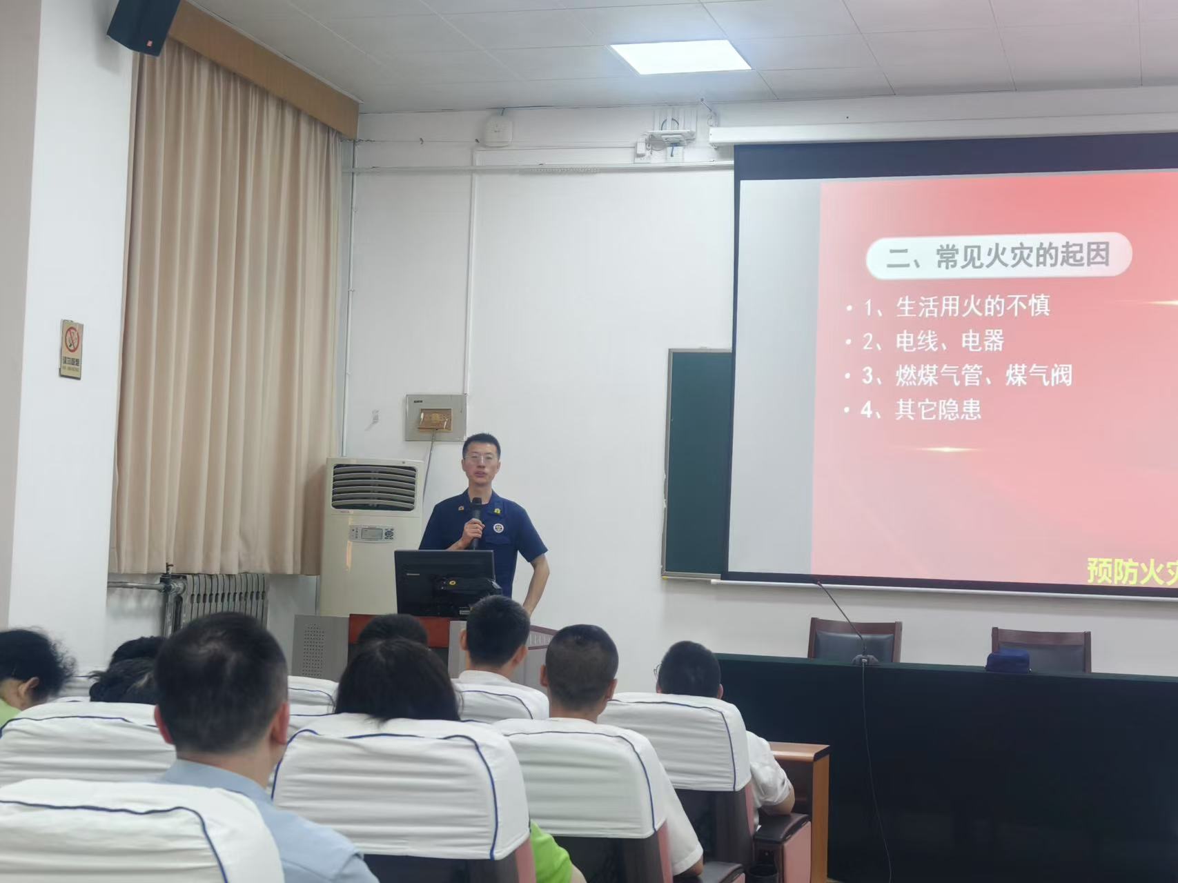 在7号楼阶梯教室,消防救援站马明从“消防警示案例”、“消防基本常识”、“发生火灾时如何自救逃生”三个方面进行了讲解并演示了消防龙带的使用方法。随后,参会人员在2号公寓楼开展了灭火疏散演练。