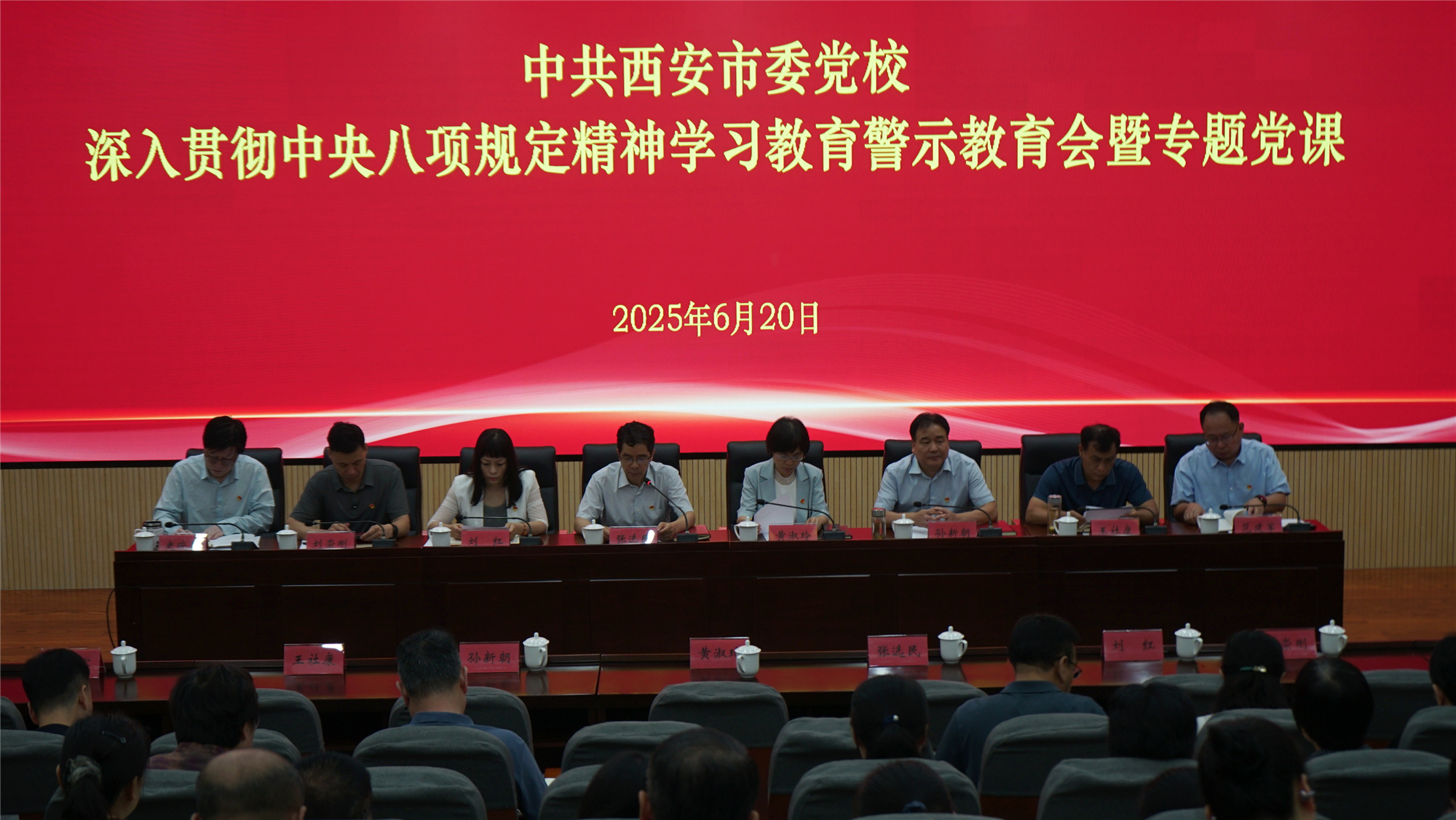 6月20日上午,我校召开深入贯彻中央八项规定精神学习教育警示教育会暨专题党课,校委班子成员、二级巡视员、全体教职工参会。市委党校常务副校长张选民主持并讲授专题党课,市纪委监委驻市委组织部纪检监察组组长黄淑玲到会指导。
