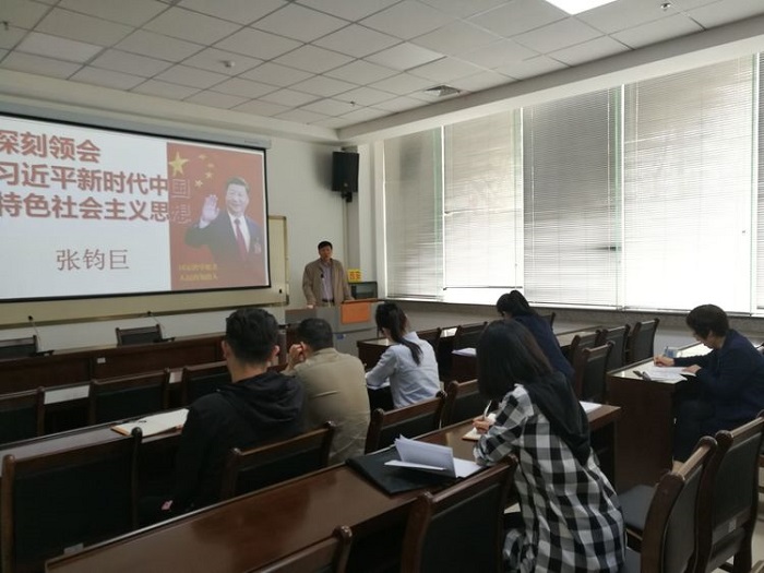 党的十九大把习近平新时代中国特色社会主义思想确立为全党的行动指南,刚刚闭幕的十三届全国人大一次会议通过的《中华人民共和国宪法》(修正案)以国家根本法的形式确立了习近平新时代中国特色社会主义思想在国家政治和社会生活中的指导地位。科学社会主义教研部把认真学习、深入研究和准确把握习近平新时代中国特色社会主义思想的基本内容、科学体系和核心要义,用以指导教学科研资政及其他各项工作作为首要任务,自党的十九大以来,通过党员研读手抄十九大报告和党章、支部组织诵读和研讨《习近平谈治国理政》第二卷等书籍、听看权威名家解读、到建设一线调研等方式,持续推进对习近平新时代中国特色社会主义思想的学习理解、贯彻落实。3月28日下午,科学社会主义教研部党支部又举行专题党课活动,由支部书记张钧巨同志以《深刻领会习近平新时代中国特色社会主义思想》为题为支部党员讲党课。